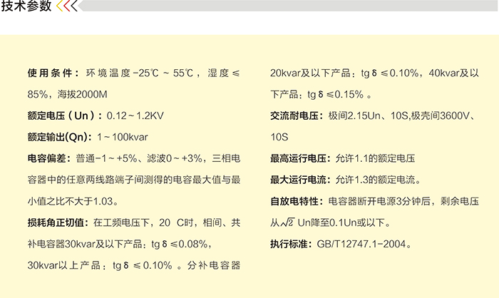 該產品采用優質的鋅鋁復合金屬化聚丙烯薄膜或金屬化內串膜作為介質,并吸收國內外先進的生產技術、工藝和設備,嚴格按照GB/T12747.1-2004標準組織生產,采用非可燃性油浸式和干式結構,安全性能高。